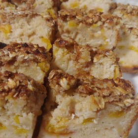 Peach Cobbler Bread with White Chocolate ganache glaze