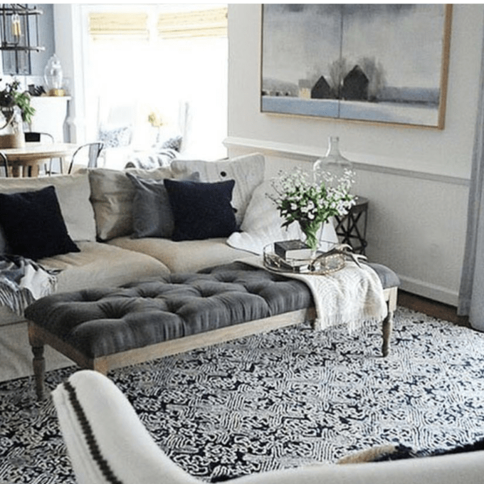 This room is a love story, I love the rug , I love the bench/coffee table, the throw pillows, and o.m.gee that painting on the wall.