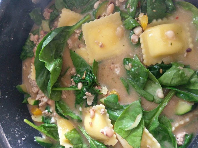In a Dutch oven saute onion, peppers, zucchini, and sausage until sausage is cooked through and no longer pink. Add the seasoning packet, beans, peas, broth, and water heat to a low boil. Add ravioli cook until tender. Add spinach and let it wilt stirring occasionally. Simmer on low for another 10min. Serve hot. Add a little mozzarella cheese upon serving if you’d like. Happy cooking, Enjoy!!