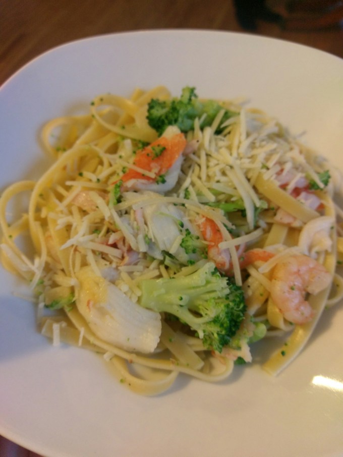 In a large sauce pan cook fettuccine and add the broccoli for the last couple minutes of cooking to get a good blanch on them. Drain and return to the pot. Stir in crab mixture sat and pepper. Plate up and top with Parmesan cheese!