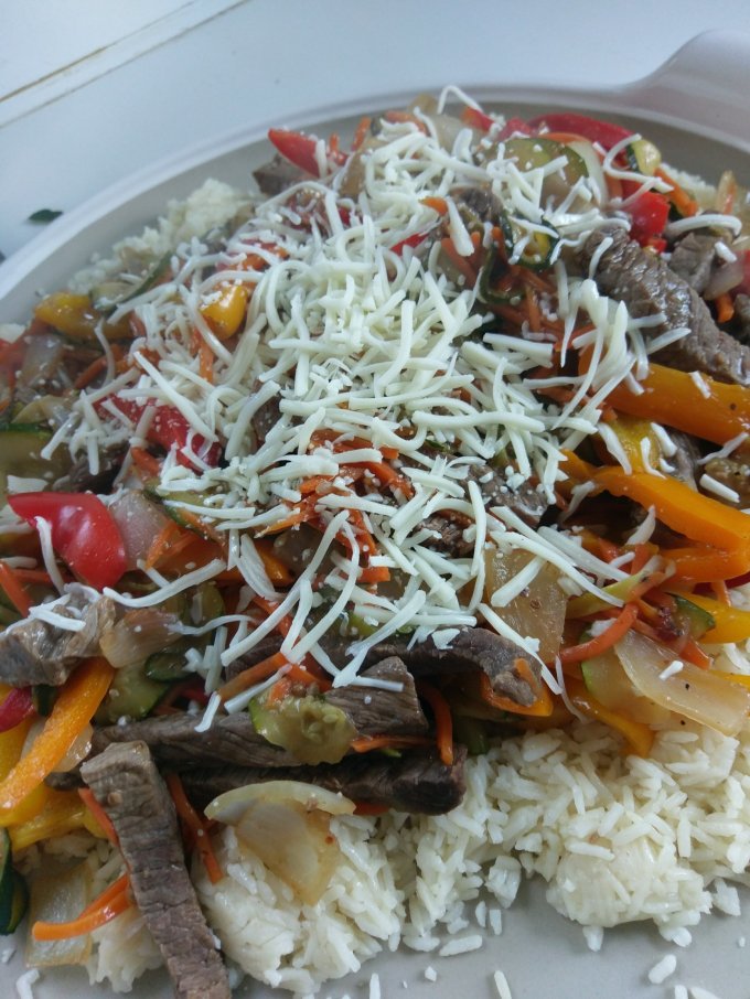 In a large saute pan or wok, heat the oil, add the marinated beef cook through about 5min on med high heat, add veggies and additional 2Tbsp of marinade cook until veggies are crisp tender. Meanwhile microwave the rice. Pour rice on to serving platter and top with beef mixture, add a sprinkle of mozzarella cheese. Serve hot! Enjoy!