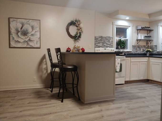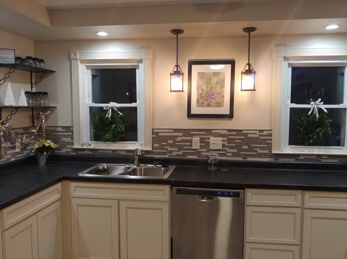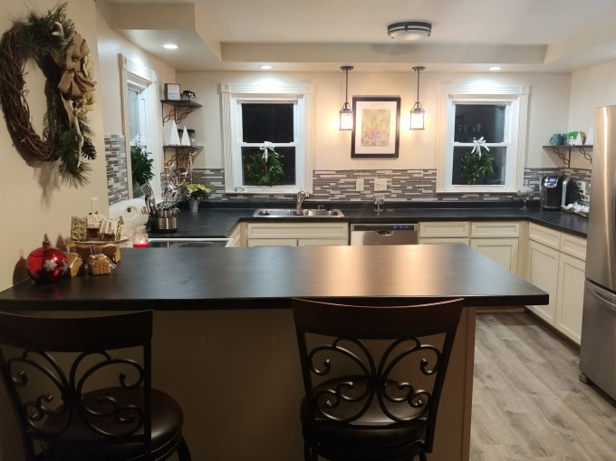 There are a few details left to tend to they include drawer pulls, roman shades on the windows and the microwave hood vent has to be installed over the stove, but with the holidays creeping up fast we’re choosing our battles. Lol!
