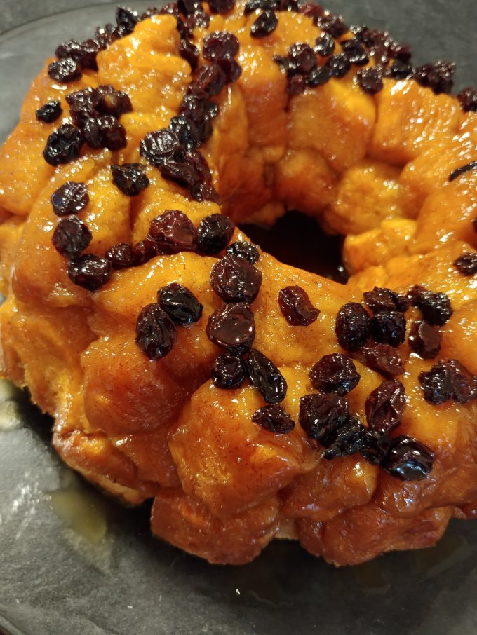 In a large bowl cut the biscuits into bite size pieces. Add granulated sugar and cinnamin. Coat the biscuits add raisins and set it aside. In a medium sauce pan melt the butter and brown sugar into a loose caramel. In a bundt pan add a small amount of raisins, and caramel sauce layer in biscuits and top with more caramel. Bake 350F for 20-30min. Turn out onto a serving plate. Pieces can be brokwn off by hand or you can cut and serve like a cake. Enjoy!