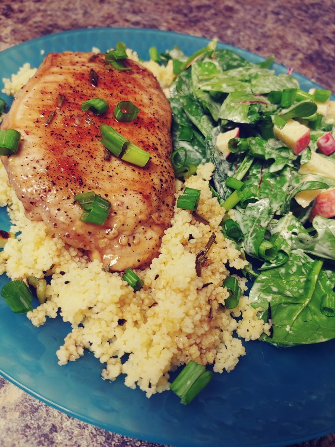 You’re ready to plate! Place couscous on plate and spoon sauce from pork chops over top, top with pork chop and sprinkle scallion greens on top. Serve with apple salad! Enjoy!!