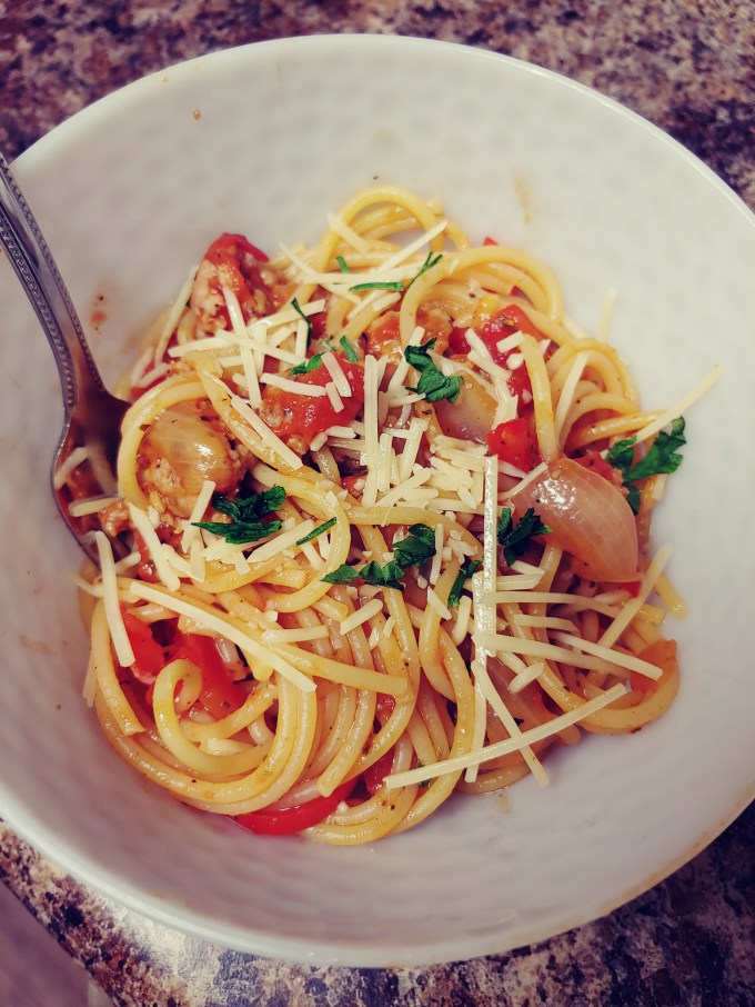 Spaghetti is a pretty regular occurance at our house it’s quick easy and can serve a large group when we need it to! So I prepared a variation on traditional spaghetti with this Tuscan Sausage version that includes red peppers and just a little tuscan spicy heat! Enjoy!