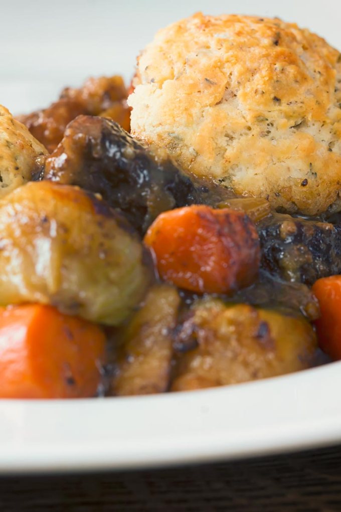 Mix bisquick mix and milk together spoon on top of stew cover and cook 30minutes until dough puffs up and springs back when touched. Spoon into a bowl and serve hot! Enjoy!!