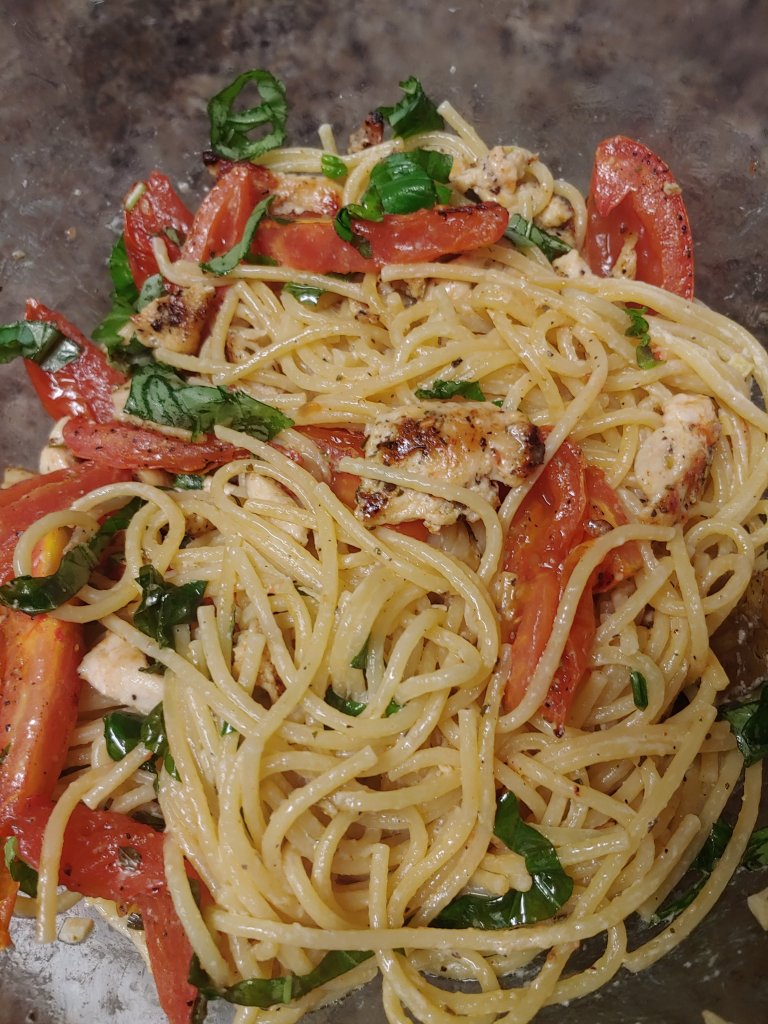 Tonight’s dinner is filling and simple, with a homemade sauce. Creamy chicken spaghetti with roasted tomatoes and basil! Yummy!