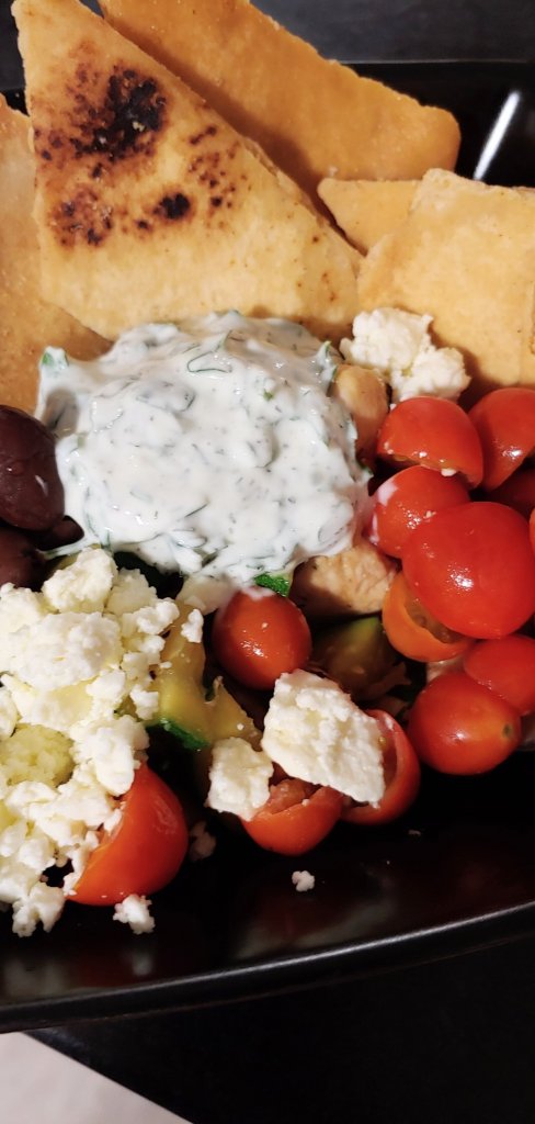 Once chicken mixture is cooked through place in a bowl and top with olives, tomatoes, feta cheese, and yogurt dressing. Add a few chips on the side. And enjoy!!