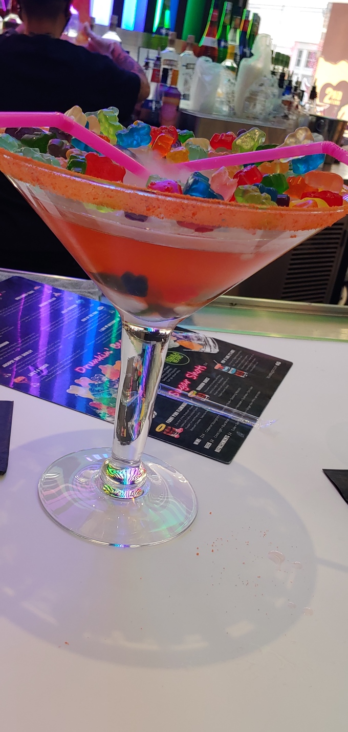 The presentation on these drinks is above and beyond. Gummy bears everywhere on top inside it’s heaped with gummy bears and they used dry ice for a bubbly smoking start! Check it out!
