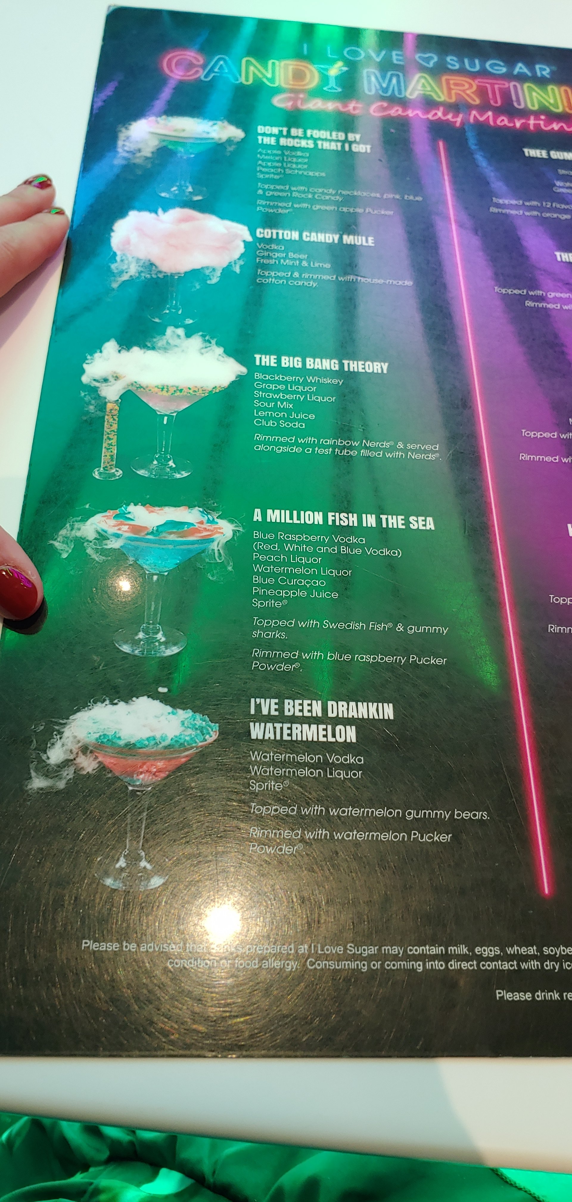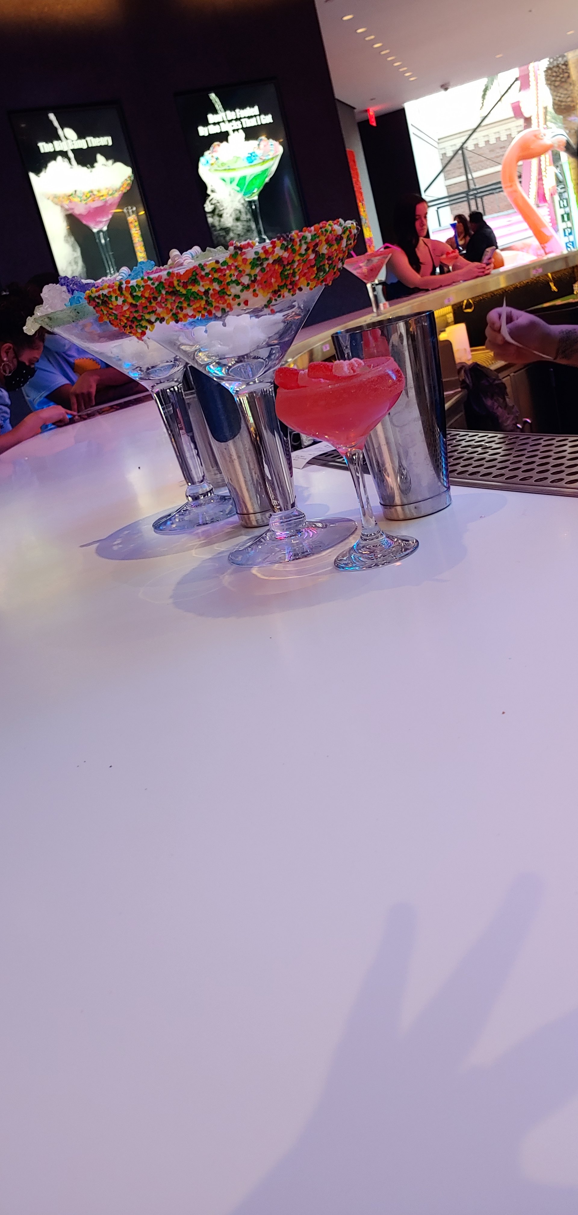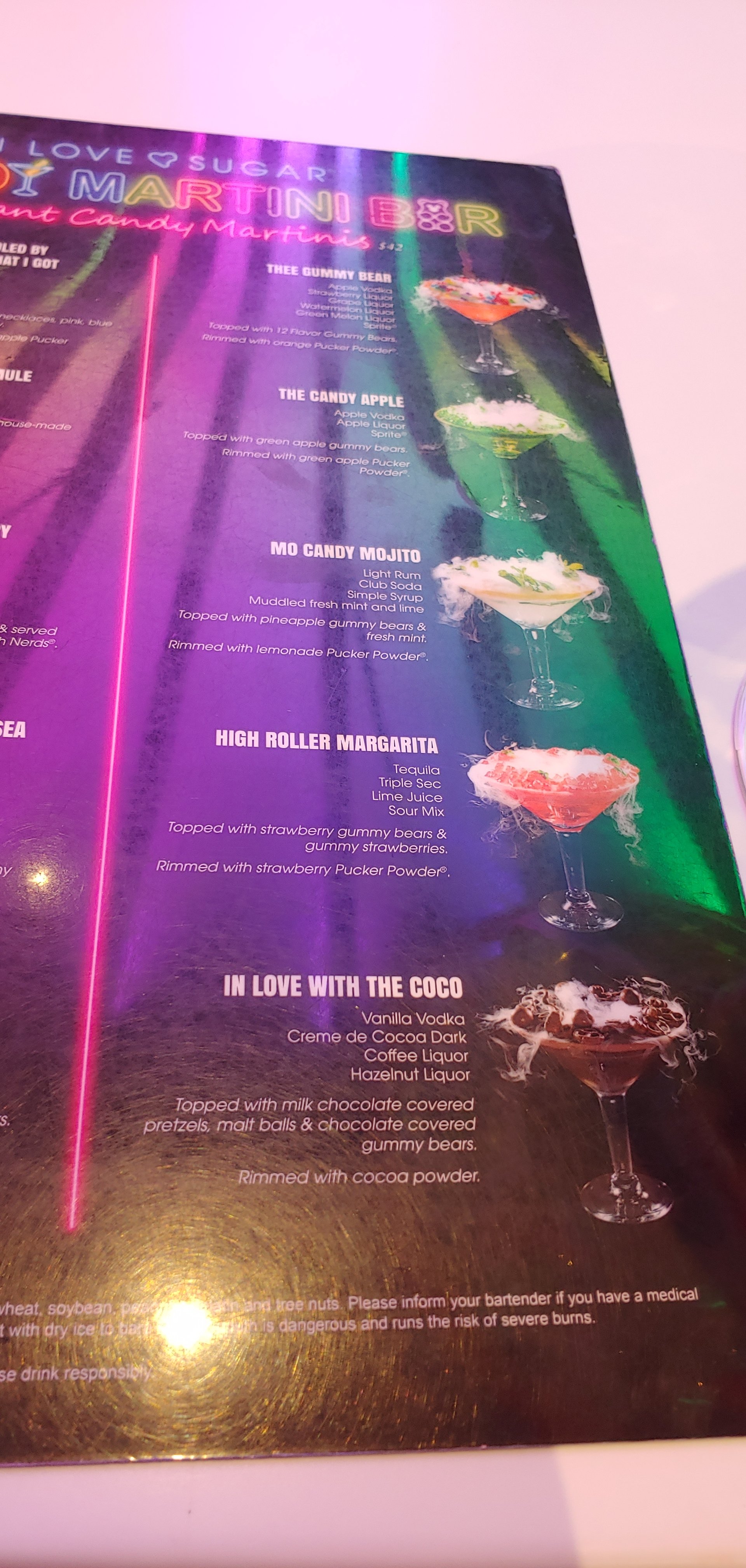 Made a pit stop while out for a walk and made our way to I Love Sugar! I Love Sugar is located in the Linq Promenade area across the walk from O’Shea’s and next door to the Flamingo Hotel and Casino. Fro. The ground level this looks like a GIANT candy store. They offer anything and everything gummy and lots of vintage candy. Great selection if you’re a PEZ enthusiast they have an entire wall of just PEZ. Very cool. Once inside take a quick trip up the escalator and you’ll find the I LOVE SUGAR bar experience!