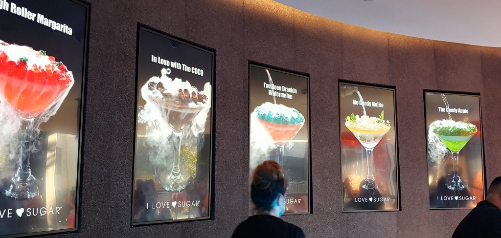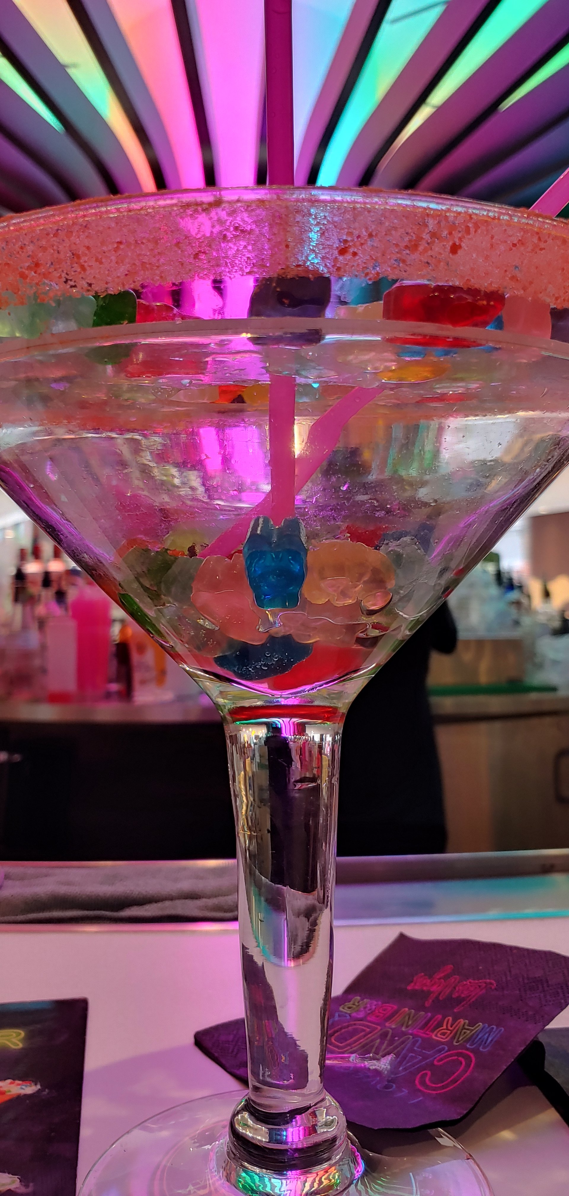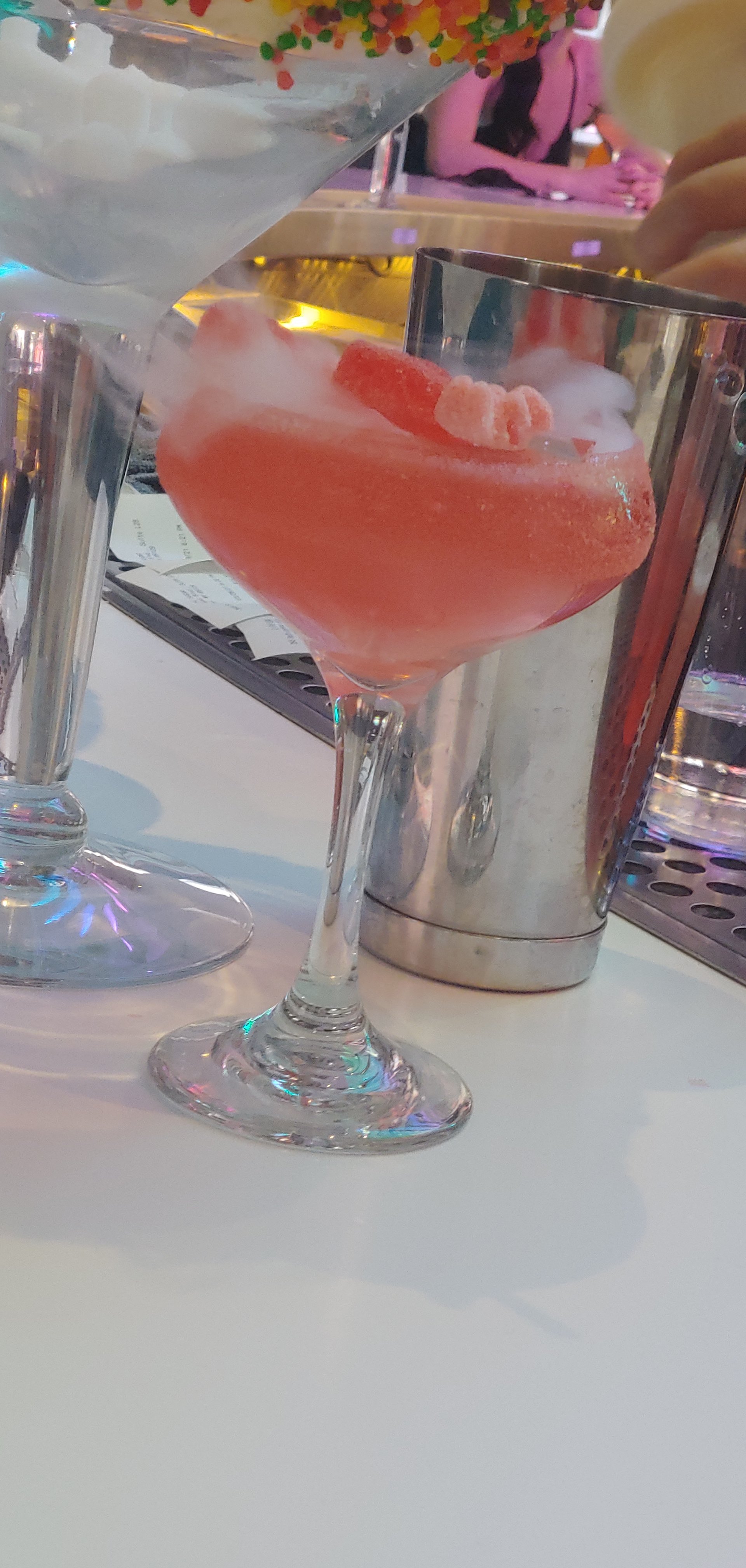 Made a pit stop while out for a walk and made our way to I Love Sugar! I Love Sugar is located in the Linq Promenade area across the walk from O’Shea’s and next door to the Flamingo Hotel and Casino. Fro. The ground level this looks like a GIANT candy store. They offer anything and everything gummy and lots of vintage candy. Great selection if you’re a PEZ enthusiast they have an entire wall of just PEZ. Very cool. Once inside take a quick trip up the escalator and you’ll find the I LOVE SUGAR bar experience!
