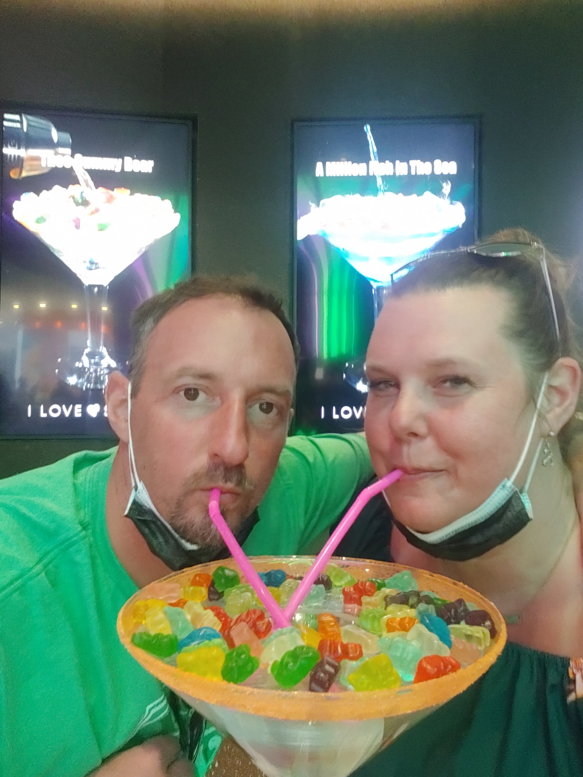 As you can imagine a specialty cocktail like these comes at a price in Vegas. One huge specialty drink is $42 we shared a big one and sipped a small version $17 just give a couple things a try. So we ordered the Gummy Bear, and to be honest I can’t remember the name of the other cocktail! Oops 😂 !