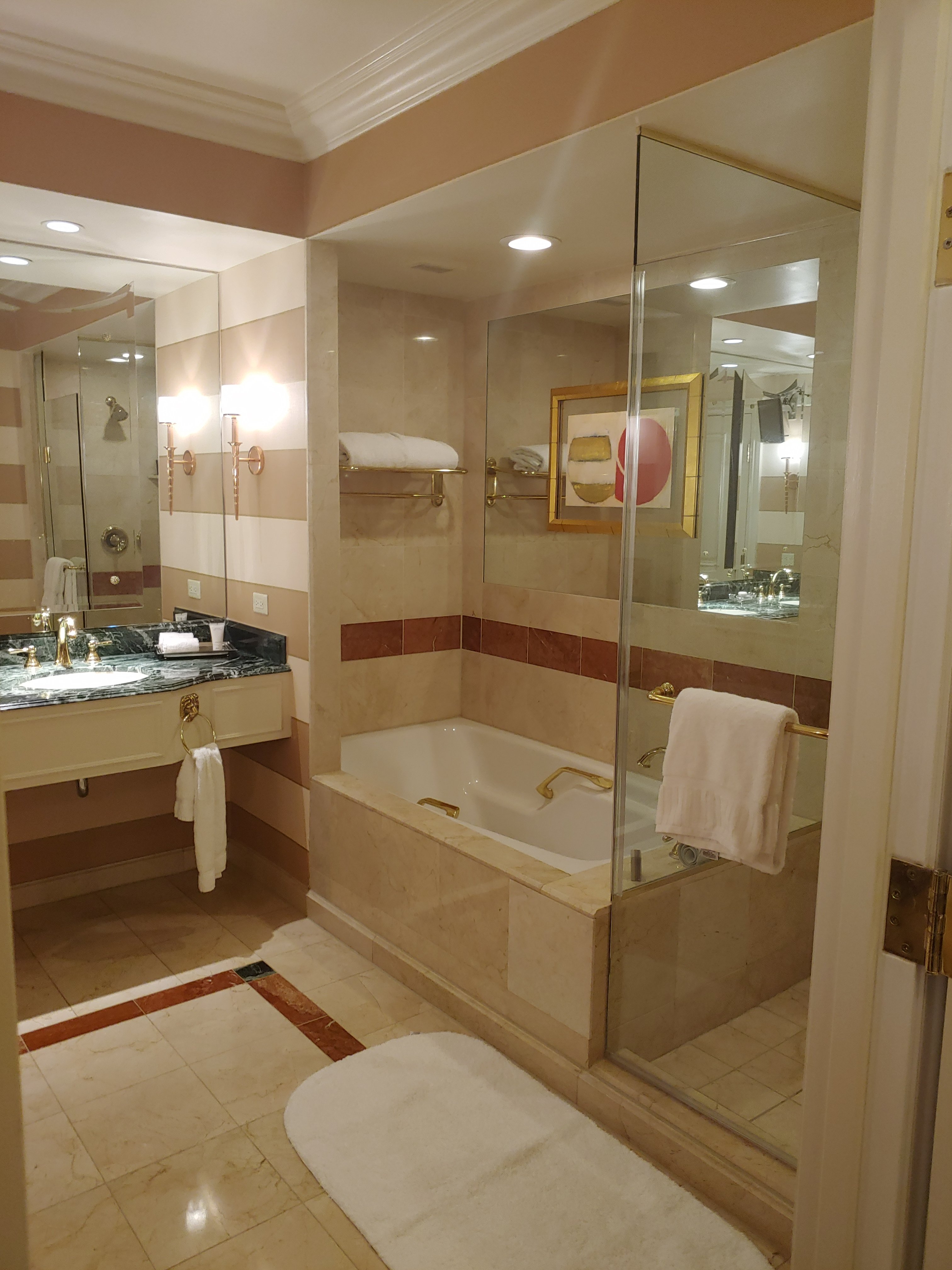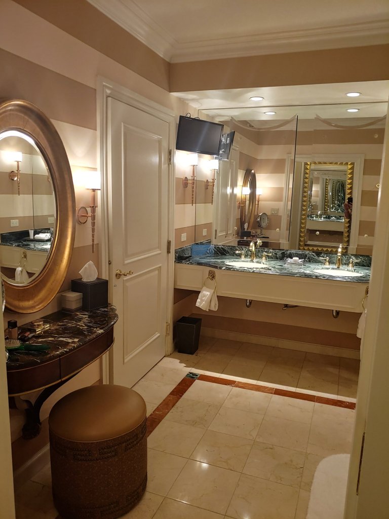 Our room was awesome! This is an all suites resort and this was a King suite. When you walk in the bathroom is to your right marble floors, mirrors for days, a nice size shower, bathtub, double sink and makeup vanity area with a separate water closet for the toilet.