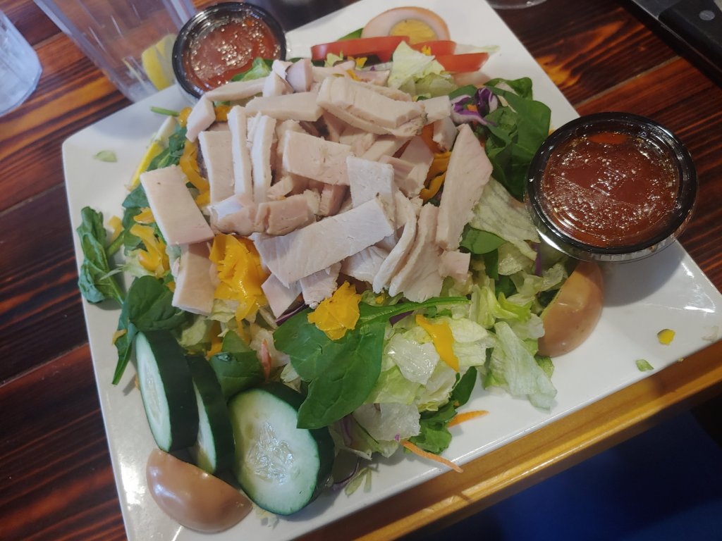 They feature a selection of entree’s from the smoker, as well as traditional meals, and local favorites. I ordered a smokehouse salad with smoked turkey, smoked eggs, and smoked cheddar cheese over a bed of greens with ” Betty’s” dressing. The dressing reminded me of a sweet vinegar catalina dressing very tasty!
