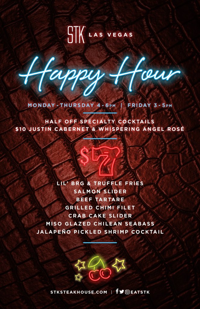 3. STK at cosmopolitan is my #3 this hit steak house the keeps it simple with every item on the happy hour food menu only $7. Choose from salmon or crab cake sliders, a burger, beef tartar, jalapeño pickled shrimp cocktail, and others. Half off specialty cocktails, and $10 glasses of Justin Cabernet and Whispering Angel rosé sweeten the deal at this hit restaurant at the Cosmopolitan. Happy hour runs Monday through Thursday from 4 to 6 p.m. and Friday from 3 to 5 p.m. in the lounge area.