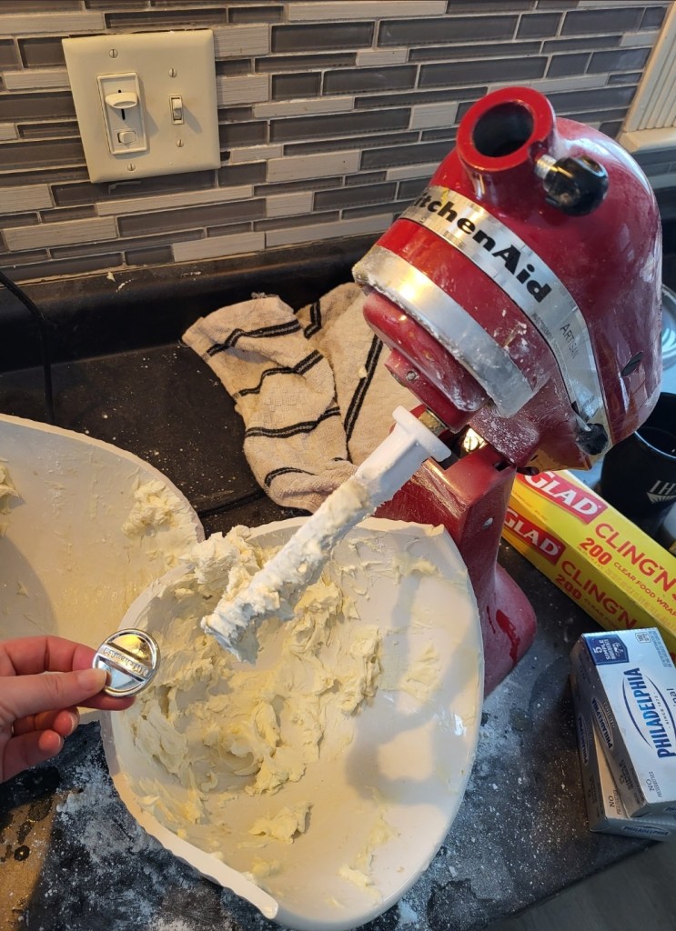 Everything went perfectly until…Sunday morning. I was preparing the last batch of roll filling needed, and tragedy struck. I have a kitchenaid mixer, and on the front of it there is a small metal cover where attachments can go onto the machine. It is held on with a small screw that I frequently have to tighten. Well, I was so busy making sure I was on track to finish this huge order and I forgot to check it. While whipping my cream cheese in a large glass bowl, the cover fell off, hit the paddle and broke my beautiful bowl in two, sending sugar and cream cheese flying everywhere! I wanted to cry!